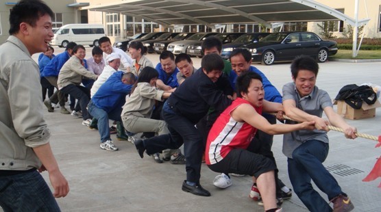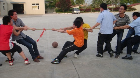 首先进行的是拔河比赛,比赛分两队进行,双方队员们一个个就像临上战场的战士,斗志昂扬,甩胳膊踢腿地进行着赛前的准备工作。随着裁判的一声哨响,比赛正式开始,参赛的双方队员齐心协力各不相让,一个个死死的拉紧绳子,使劲用力地向后拉,一条沉重的绳子被双方队员拉得笔直,场上的双方队员在奋力拼搏的同时,而场下拉拉队也不甘示弱,拉拉队的呐喊如雷贯耳,队员们鼓足了劲,涨红了脸,抓紧了绳,全力以赴,努力争夺。