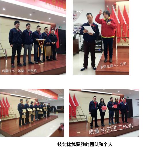 2015年质量月活动自11月1日开展以来至今历经40余天,期间进行了激烈的技能比武,共评选出五名后道技术能手,三名先进机台。通过质量月的比、评、赶、帮、超的一系列活动,全程由公司技术总顾问徐观明教授指导、点评、改进,发现并筛选了一批技术能手,对个别表现突出的人员给予破格晋升和奖励。比如储备干部王超,以其贴切实际的深刻论述和优雅从容的现场表现征服了在座评委,在此次演讲比赛中获得主管组第二名。比赛结束后便被公司高管约谈,直接晋级到分公司做制造部经理。今年像这样通过技能比武和各类比赛直接晋级的还有2名员工。再如单C机台,凭借傲居榜首的合格率和机台长的自信,在质量月期间主动要求撤出品保人员、自产自检,开创了机台自主管理、自我监督、自发赶超的先例,在今天的大会上也作为典型先进事迹予以表彰,并直接奖励红包1500元。