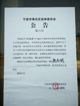此次选举从2016年10月份开始筹备,共有两位候选人参选。我司位于奉化区江口街道的第十一选区,除我司之外,该选区还下辖禾家桥村、龙潭墩村、下王渡村、仓基村,覆盖区域的选民接近2600人。正式投票于今天早上8:00举行,参加投票人员共计2541人。经过紧张的统计,阮红斌同志以2454票当选为奉化区人大代表,得票率高达96.58%!