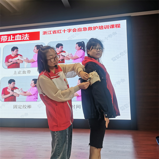 丁老师向大家讲解了红十字运动基本知识、应急救护概论、心肺复苏理论与实操、AED的使用及注意事项、气道异物梗阻、创伤救护概论及四大技术“止血、包扎、骨折、搬运”,对一些相关救护操作要领进行了现场示范操作。
